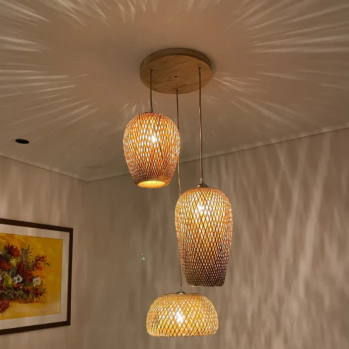 Suspension rotin et bambou 3 lampes dépareillées