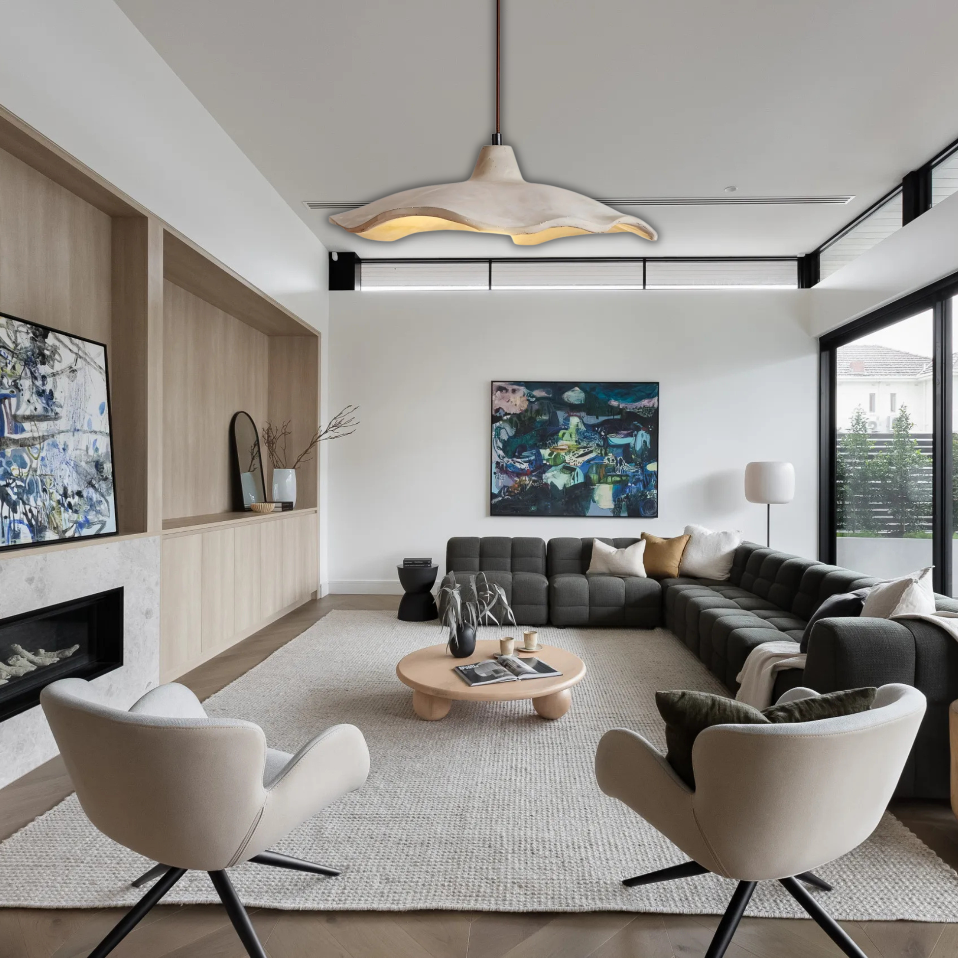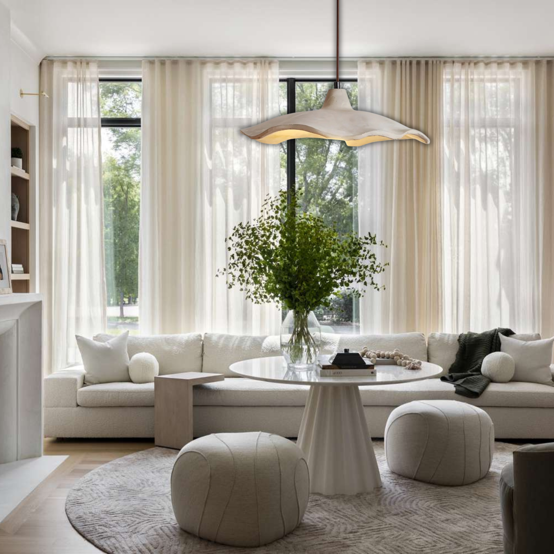Naturelle et apaisante, cette suspension triangulaire en terre cuite séduit par son design scandinave minimaliste et sa teinte beige sable. Sa texture terreuse et sa forme asymétrique diffusent une lumière douce, idéale pour instaurer une atmosphère chaleureuse et équilibrée dans un salon, une cuisine ou une chambre.