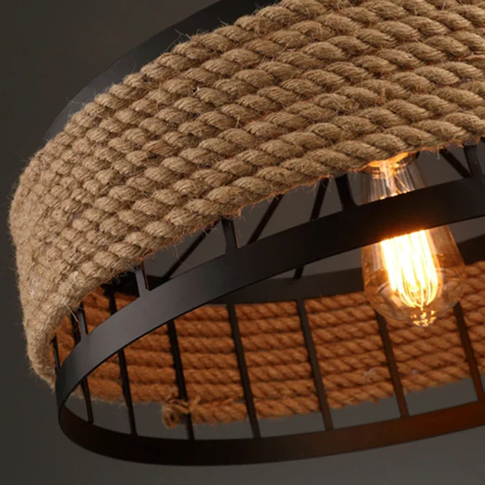 Cette suspension en métal noir et corde de chanvre incarne l’essence du design industriel. Son abat-jour ajouré et sa texture naturelle offrent un contraste saisissant entre robustesse et chaleur. Parfaite pour un salon ou une cuisine, elle apporte une touche de caractère et d’élégance brute à votre intérieur.