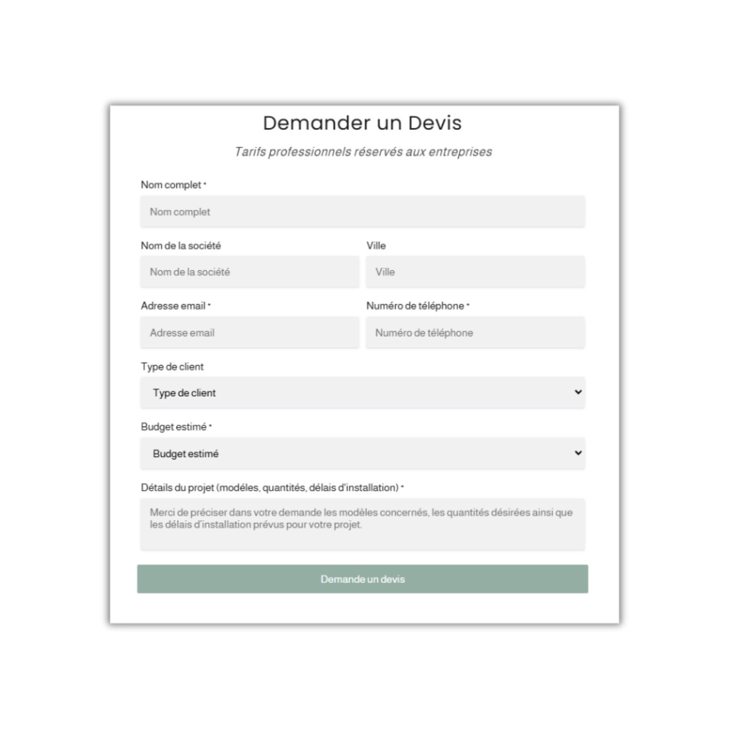 Vous nous contactez via le formulaire de devis en précisant les produits, les quantités et les délais souhaités.